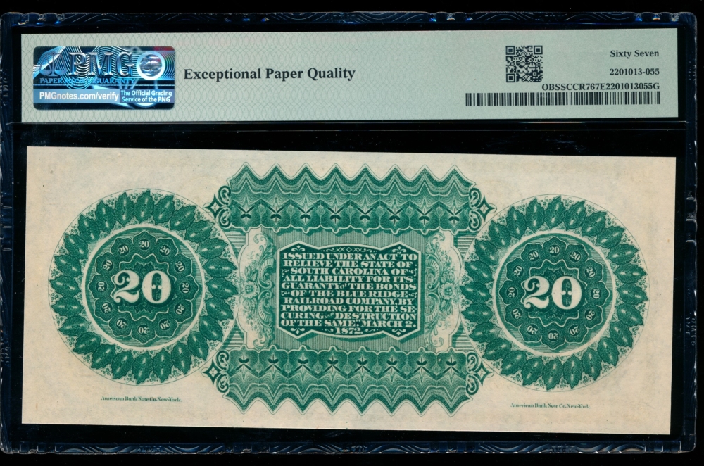Fr. Cr SC-8 1872 $50 Obsolete State of South Carolina, Columbia, SC PMG 67EPQ 2414